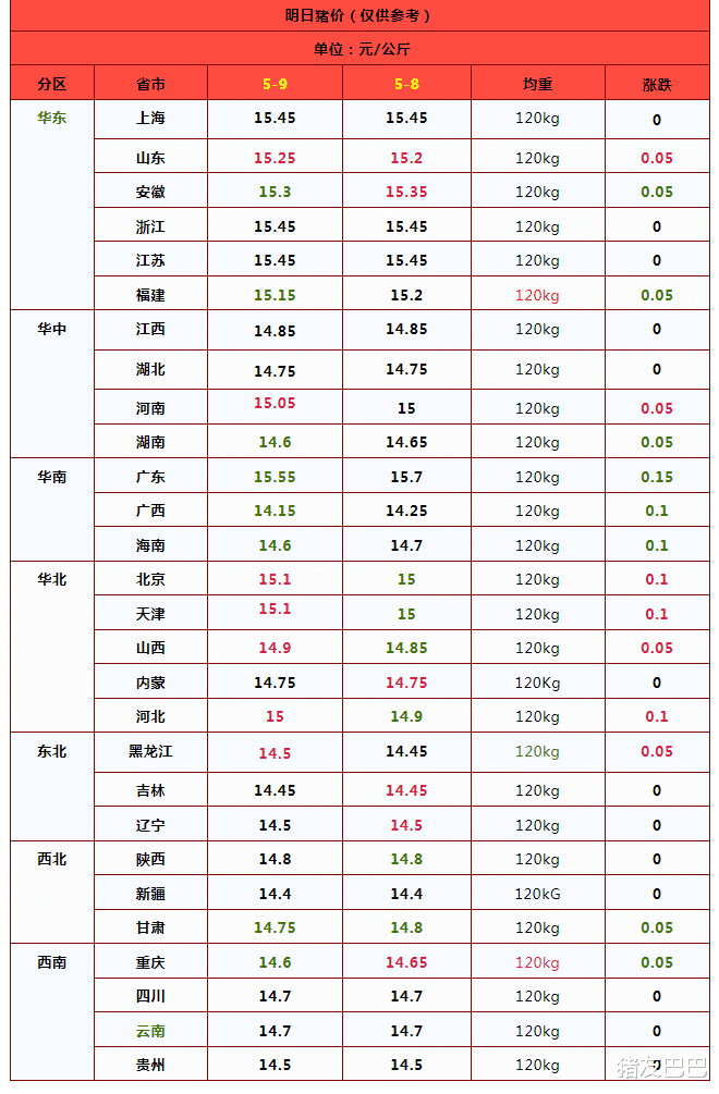 因此,在供需博弈下,目前,猪价以横盘为主,南北地区,屠宰场顺利收猪的难度不大,市场多以大稳小动为主!预计,2025年5月9日,全国外三元标猪出栏报价横盘在14.8元/公斤,零星地区,屠企报价略有涨跌震荡的走势!